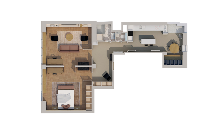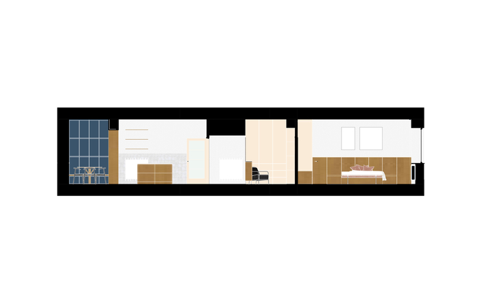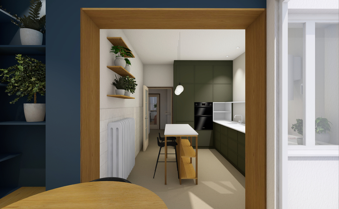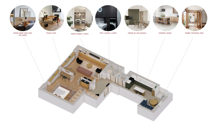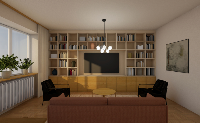 Návrh interiéru prvorepublikového bytu v Brně se nese v zemitých barvách, které krásně doplňují stávající dubové vlýsky a přírodní marmoleum se vsypem kakaových zrn na podlaze. Zrušením pokoje pro služku jsme získali prostor pro jídelní stůl s přímým vstupem na balkón.
